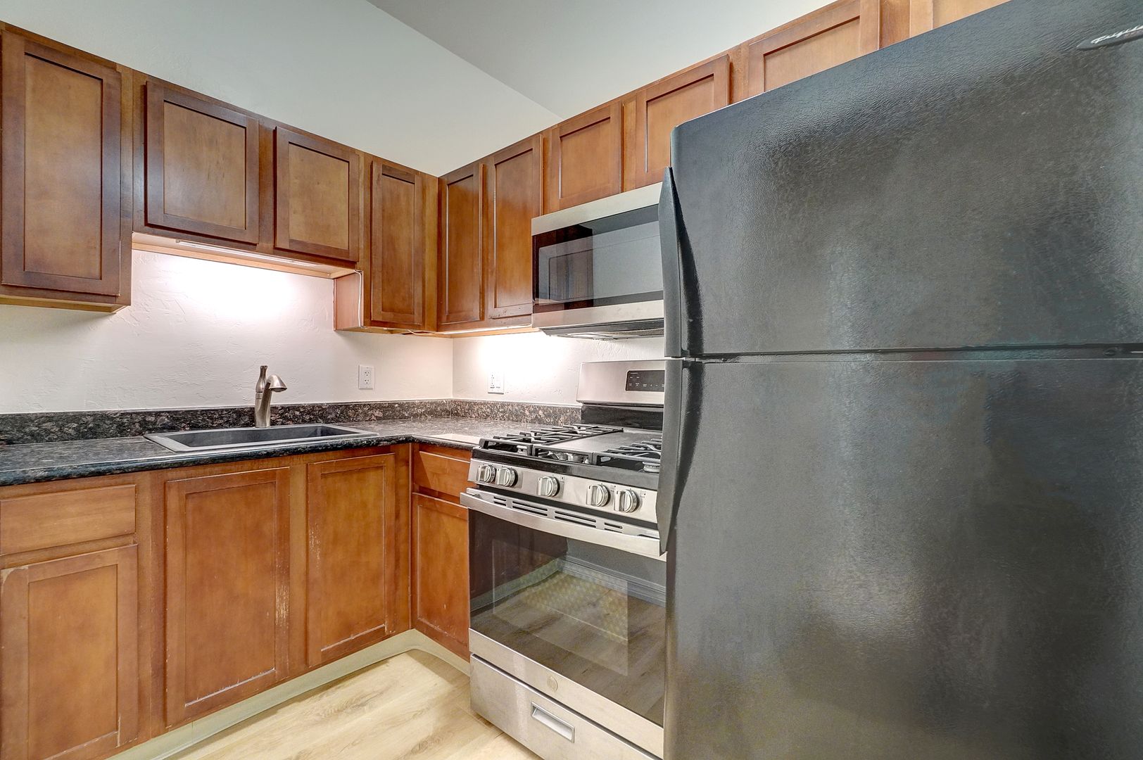 -Modern kitchen with stove, fridge, dishwasher, and microwave